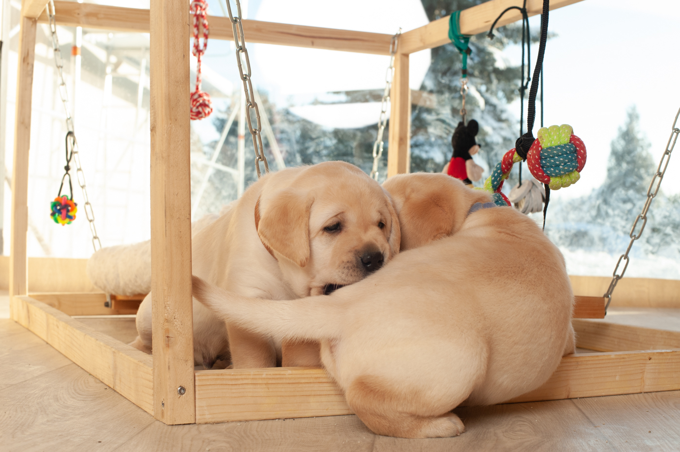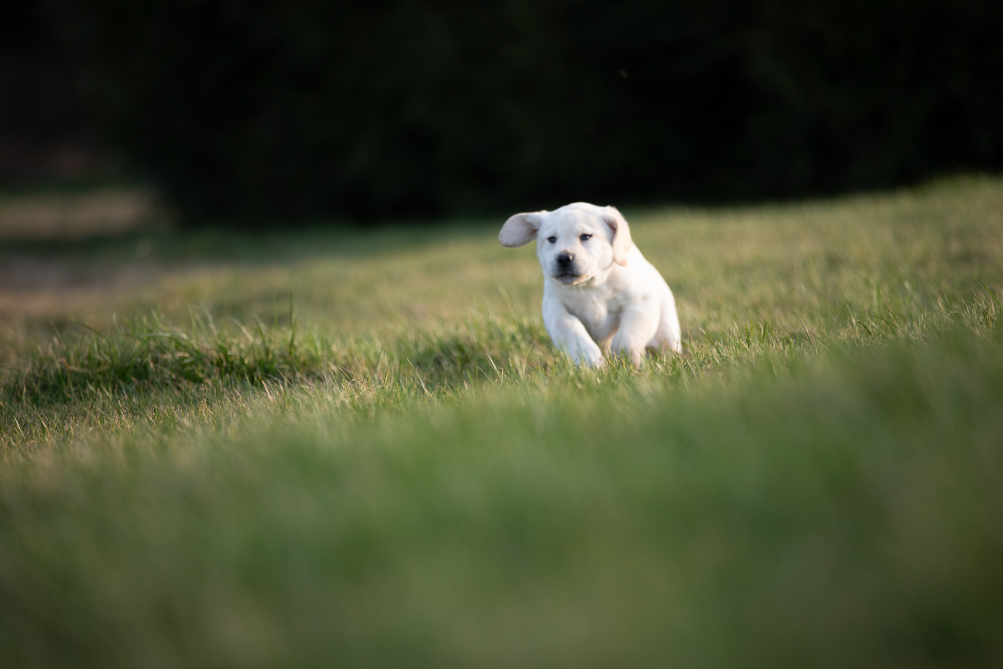 Jeder einzelne Labrador Retriever Welpe entdeckt nun nach und nach den Innen- und Außenbereich. Der Lebensraum der Welpen erweitert sich dabei Schritt für Schritt: Zunächst erkunden sie einen geschützten Außenbereich von etwa 50 m², anschließend rund 100 m², bevor ihnen schließlich der große Garten mit etwa 4000 m² offensteht.